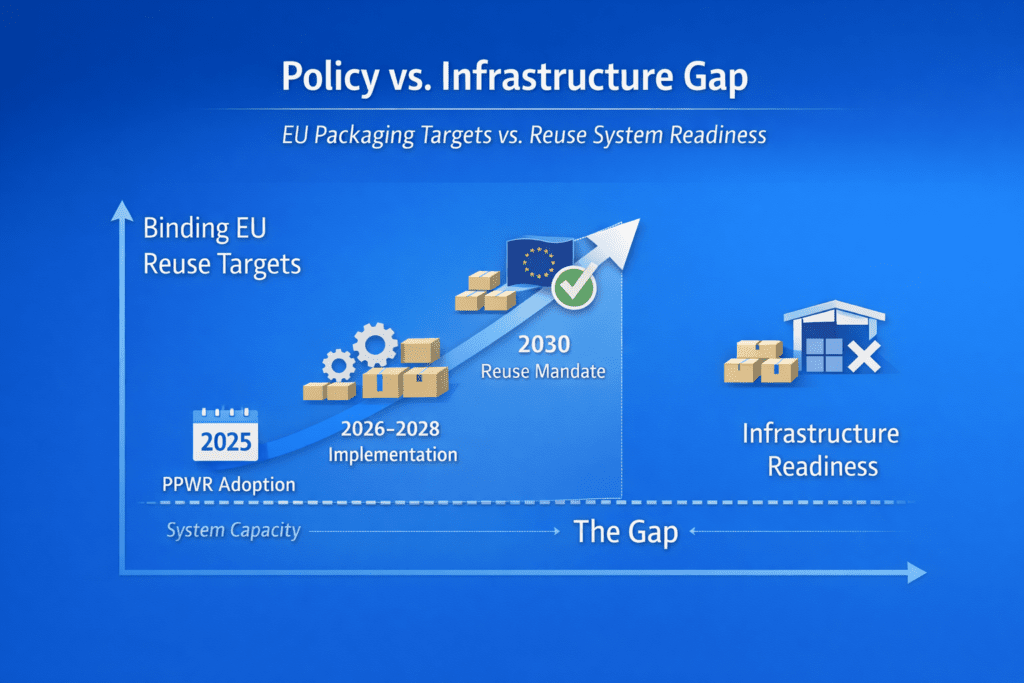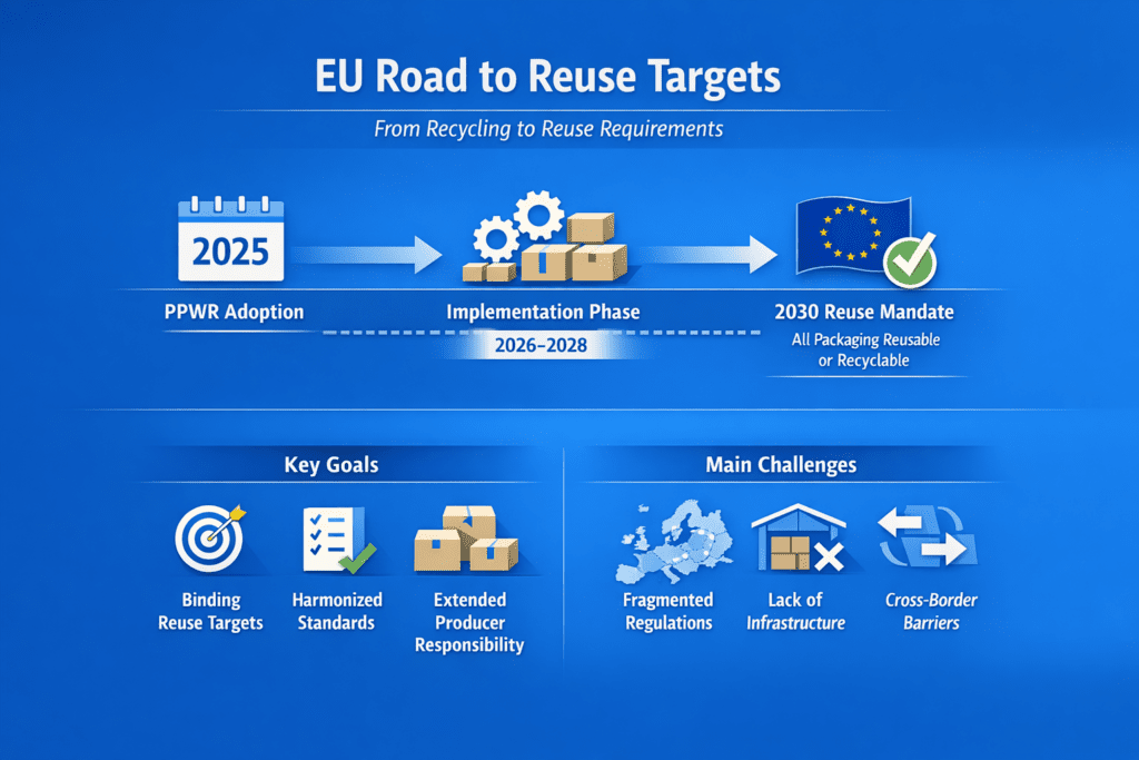 This shift is driven by the European Union’s move away from a recycling-centred model toward a reuse-driven circular economy. The upcoming Packaging and Packaging Waste Regulation (PPWR) is the most significant policy instrument in this transition, introducing binding reuse targets, harmonised design requirements, and stronger Extended Producer Responsibility obligations.